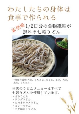【レストランKOO】5月は期間限定で「1/2日分の食物繊維が摂れる七穀うどん」を提供いたします。