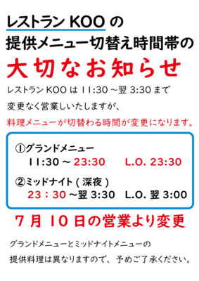 【メニュー切替時間変更のお知らせ】レストランKOOの提供料理は時間帯によって異なります