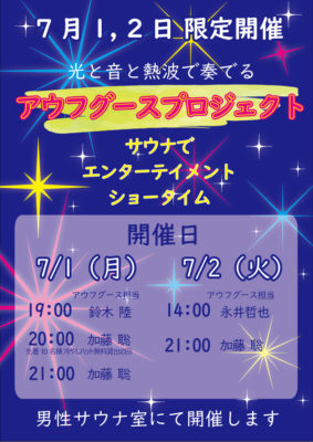 7月1日、2日はサウナでエンターテイメントショー!アウフグースプロジェクト開催