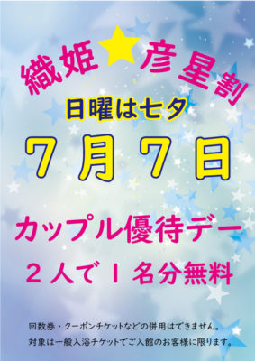 スカイスパで七夕☆カップル優待デー☆2名様入館で1名様無料