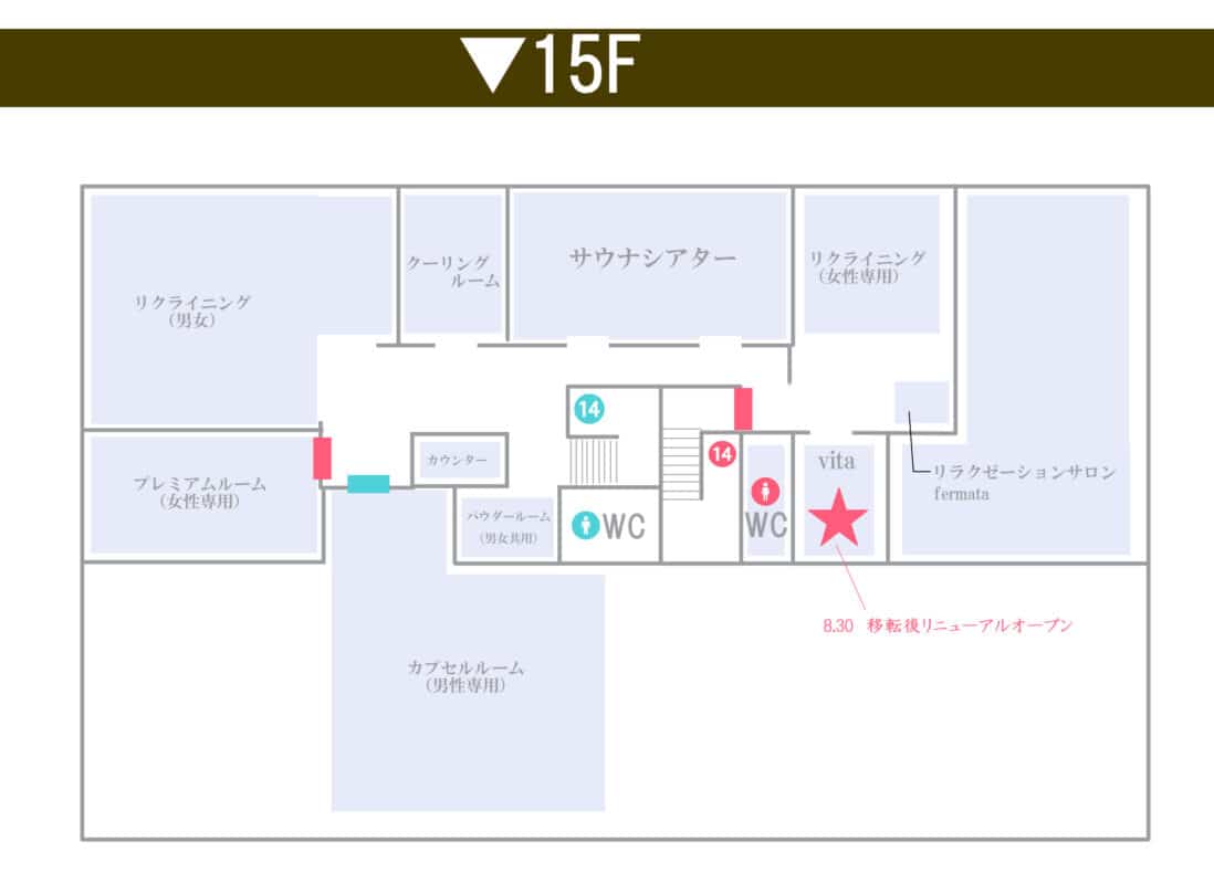14Fスカイスパエントランス前からスカイスパ内15Fに移転いたします。