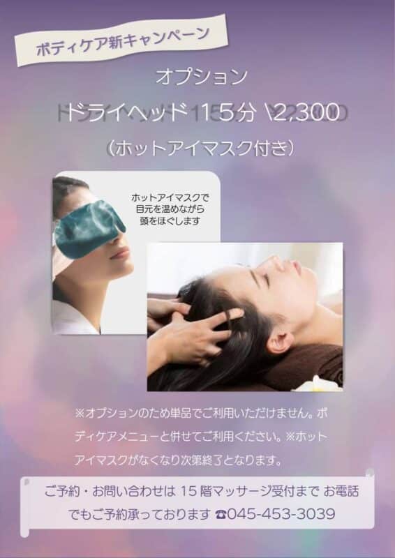【オプション ドライヘッド15分 ¥2300 ホットアイマスク付き】