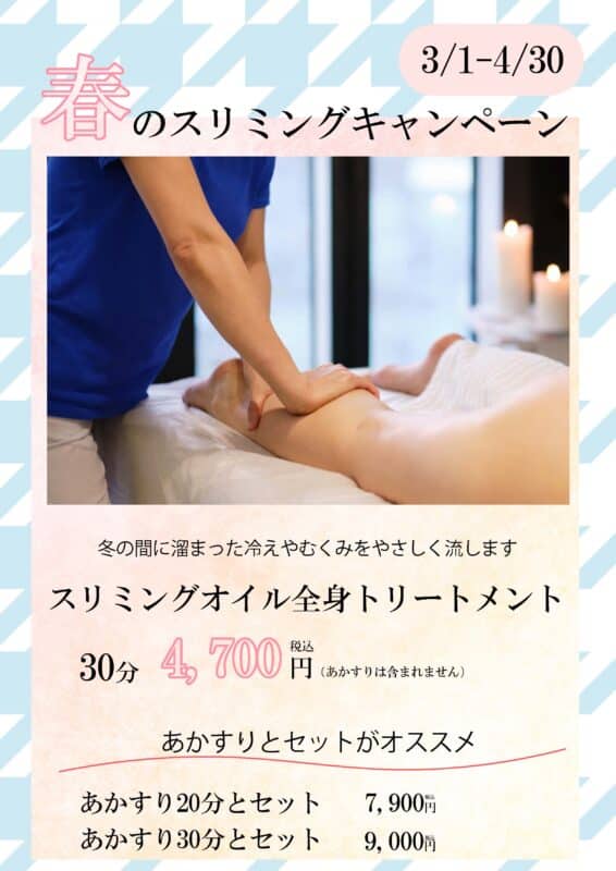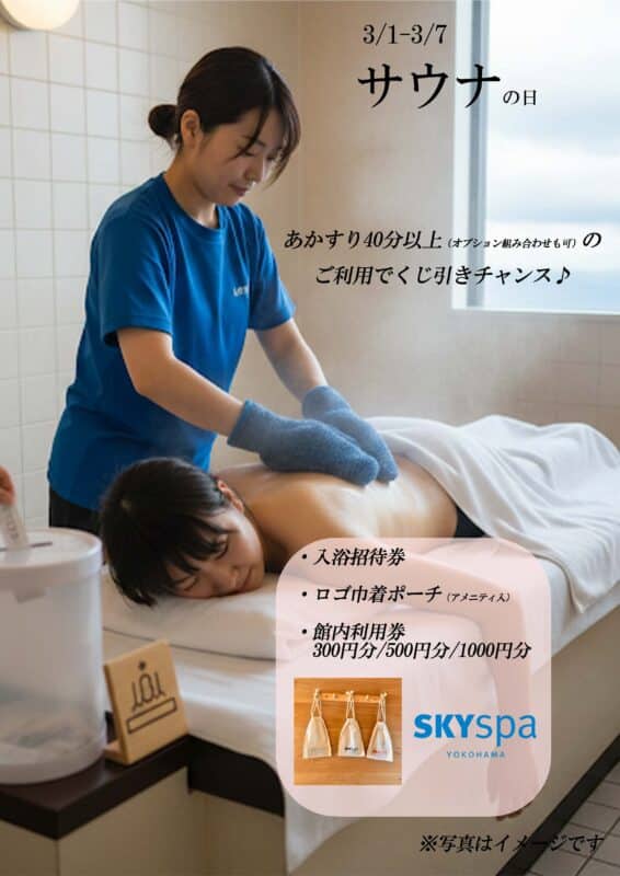 SKYSPA NEWS、キャンペーン・トピックス情報3/1_あかすりスリミングオイルトリートメント&サウナの日お楽しみくじ Posted on 2026年2月27日2026年2月27日 by skyspa PR 3/1~4/30 冬の間に溜まったむくみをやさしく流します♪【スリミングオイルトリートメント】 男性 女性 3/1~3/7 サウナの日はあかすりもセットで♪入浴招待券などが当たるお楽しみくじをご用意しました 3/7はサウナの日♪
