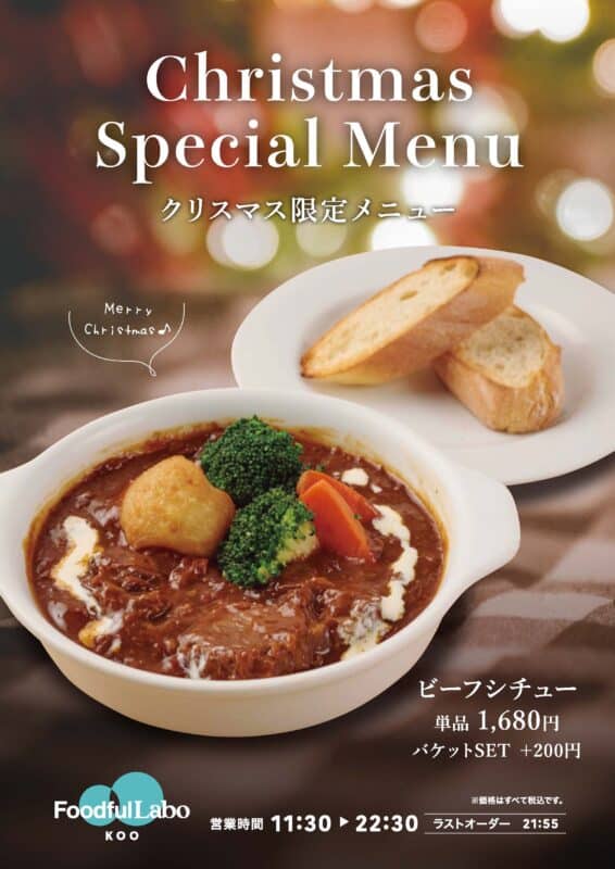 キャンペーン・トピックス情報、レストランKOO(TOPICS)、SKYSPA NEWSレストランKOO クリスマス限定メニュー【12/10-12/25】 Posted on 2025年12月1日2025年12月11日 by skyspa PR クリスマス限定メニューにビーフシチューが登場です♪ バケット&ワインと合わせるのもGOOD♪ 年末年始特別料金のご案内 リラクゼーションサロン【fermata】デトックス120分コース♪