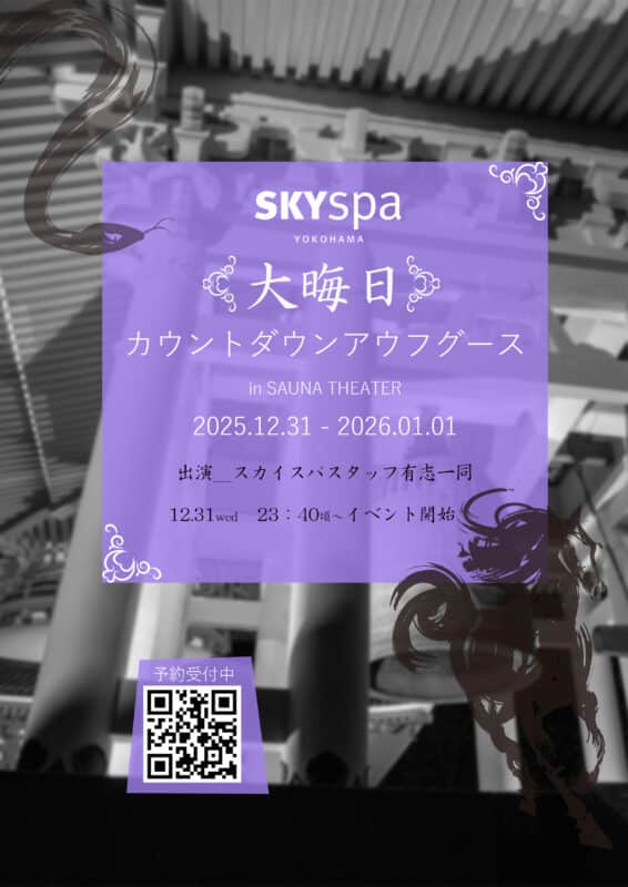 アウフグース、キャンペーン・トピックス情報、SKYSPA NEWS12/31_大晦日・カウントダウン・アウフグースのご案内 Posted on 2025年12月10日2025年12月26日 by skyspa PR 2025年の締めくくり&新年の瞬間をSAUNA THEATERで迎えませんか? 男女どなた様もご参加いただけます。 【大晦日カウントダウンアウフグース】 日時 23:40~ 会場 SAUNA THEATER 料金 1,000円(入館料別) 〉イベント予約 12/25_クリスマス・アウフグース・イベントのご案内 01/05_回数券SALE&Wポイントキャンペーン