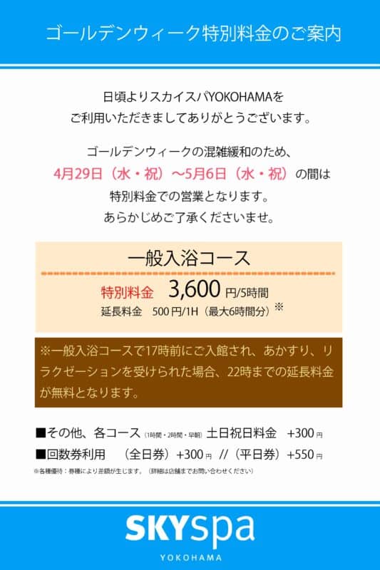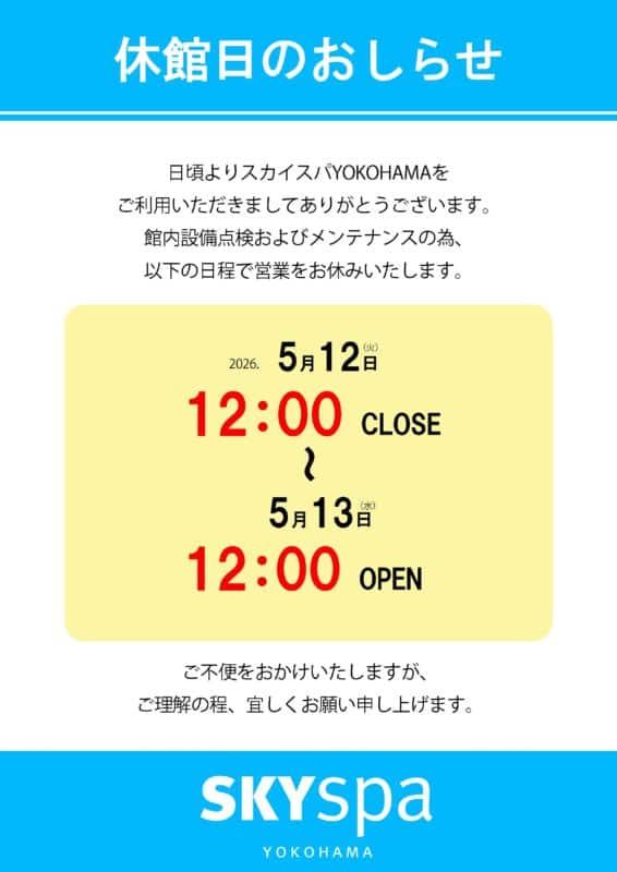 日頃よりスカイスパYOKOHAMAをご利用いただきましてありがとうございます。